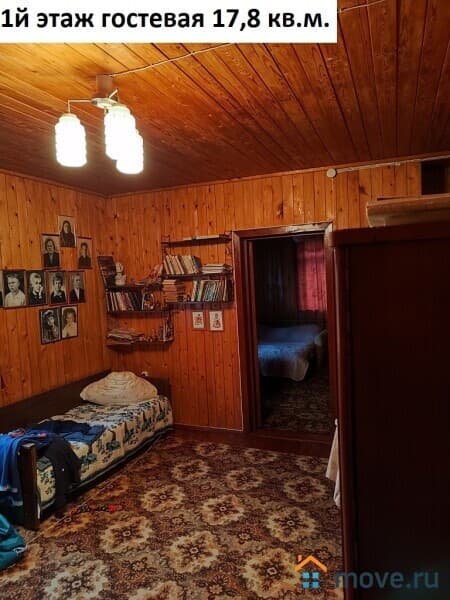На первом этаже: веранда 23,9 кв.м. (диван, два кресла, два стола, стулья, холодильник), спальня 12,5 кв.м. (кровать, кресло, стул, тумбочка под телевизор), комната 12 кв.м. (кровать, два кресла, комод), гостевая 17,8 кв.м. (диван, полки, шкаф), кухня 14 кв.м. (два стола, стулья, полки, холодильник), раковина 1,8 кв.м. На втором этаже три помещения: 19,7 кв.м., 16,8 кв.м., 6,9 кв.м.