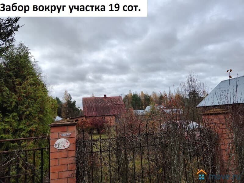 Участок ровный, сухой. Забор по периметру из металлических прутьев, кирпичные столбы. Плодовые деревья, яблони, смородина, крыжовник, слива. Выложены дорожки.
